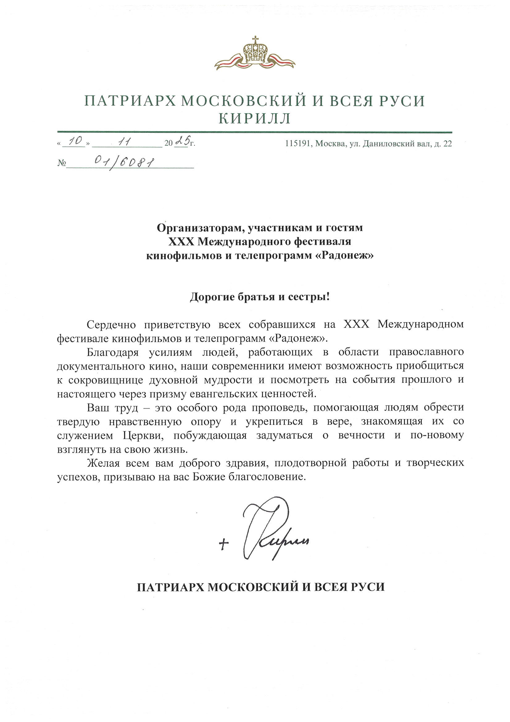Приветствие Патриарха Московского и всея Руси Кирилла фестивалю «Радонеж»