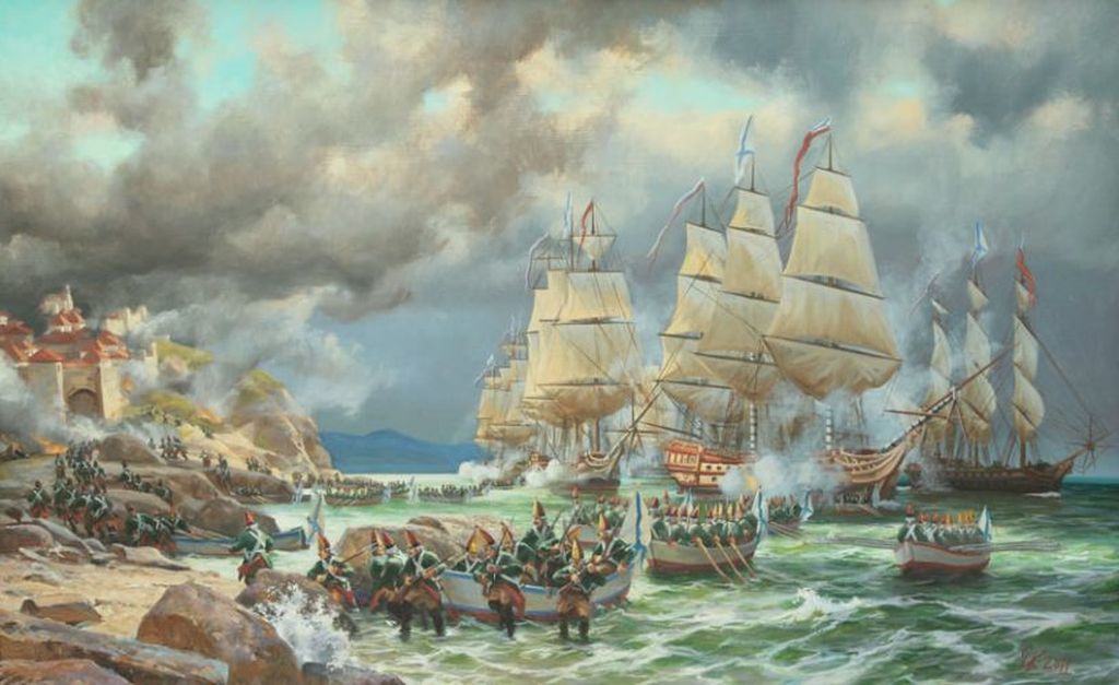 На исходе XVIII столетия Россия вела войну с Францией, пребывая в состоянии военно-политического союза со вчерашним врагом -- Османской державой. Большая российско-турецкая эскадра осадила мощную французскую крепость (точнее, целый комплекс крепостей) на острове Корфу. Командовал морским соединением святой благоверный воин адмирал Федор Федорович Ушаков. В феврале 1799 года состоялся штурм Корфу объединенными русско-турецко-греческими силами.